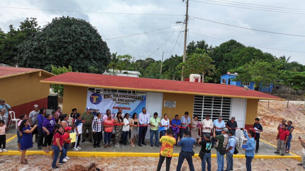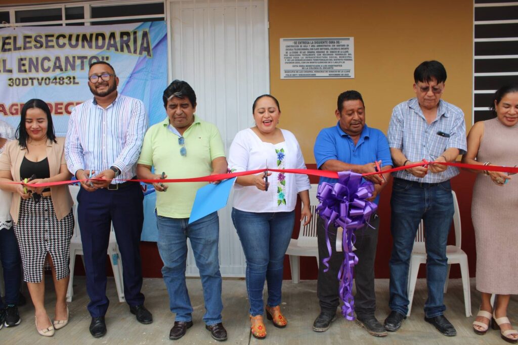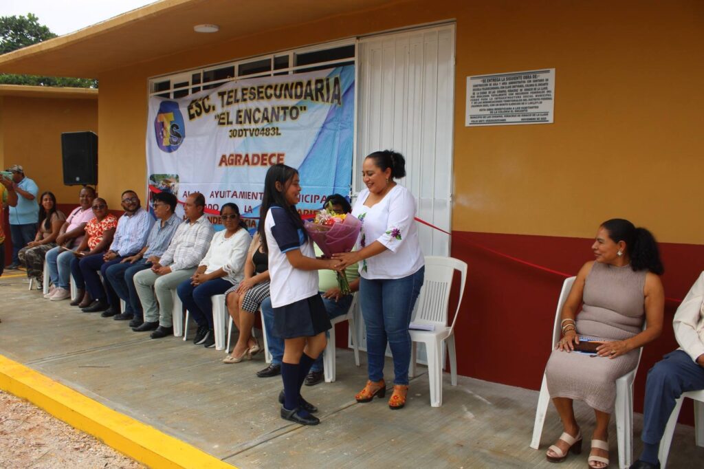 Las Choapas, Ver., a 12 de diciembre de 2025.- En un emotivo evento en donde participaron estudiantes de la telesecundaria El Encanto, la Presidenta Municipal Mariela Hernández García, acudió ayer a realizar la entrega de un aula, oficinas administrativas y sanitarios, para este plantel que en 2024, también se le construyeron 2 aulas y sanitarios.