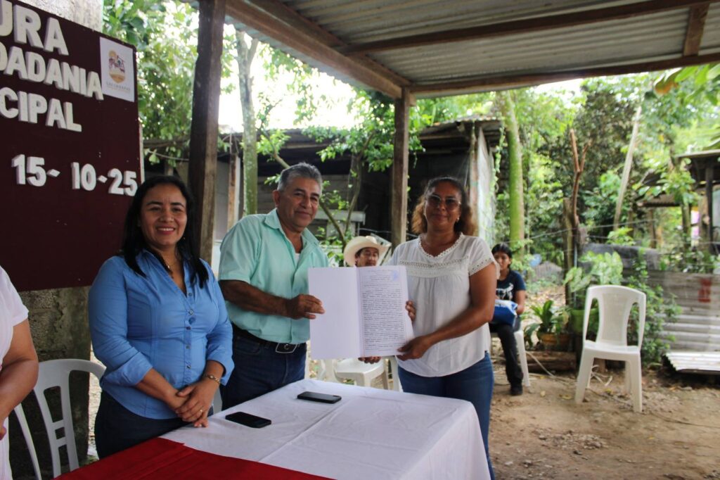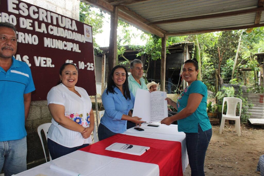 Las Choapas, Ver., a 15 de octubre de 2025.- Pobladores de la comunidad Cerro de Nanchital, recibieron este día las Escrituras Públicas que los acreditan como propietarios de los predios que habitan y con ello tienen la certeza jurídica de que estos inmuebles son de ellos y de nadie más.